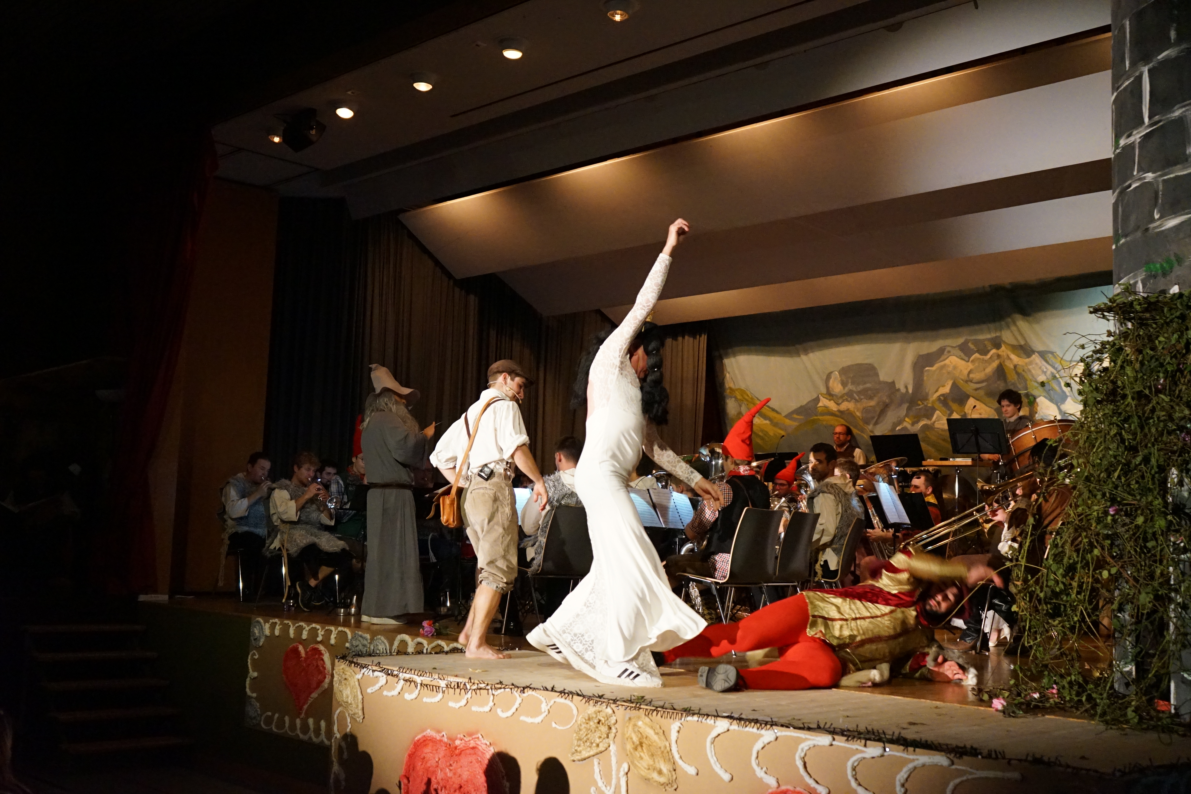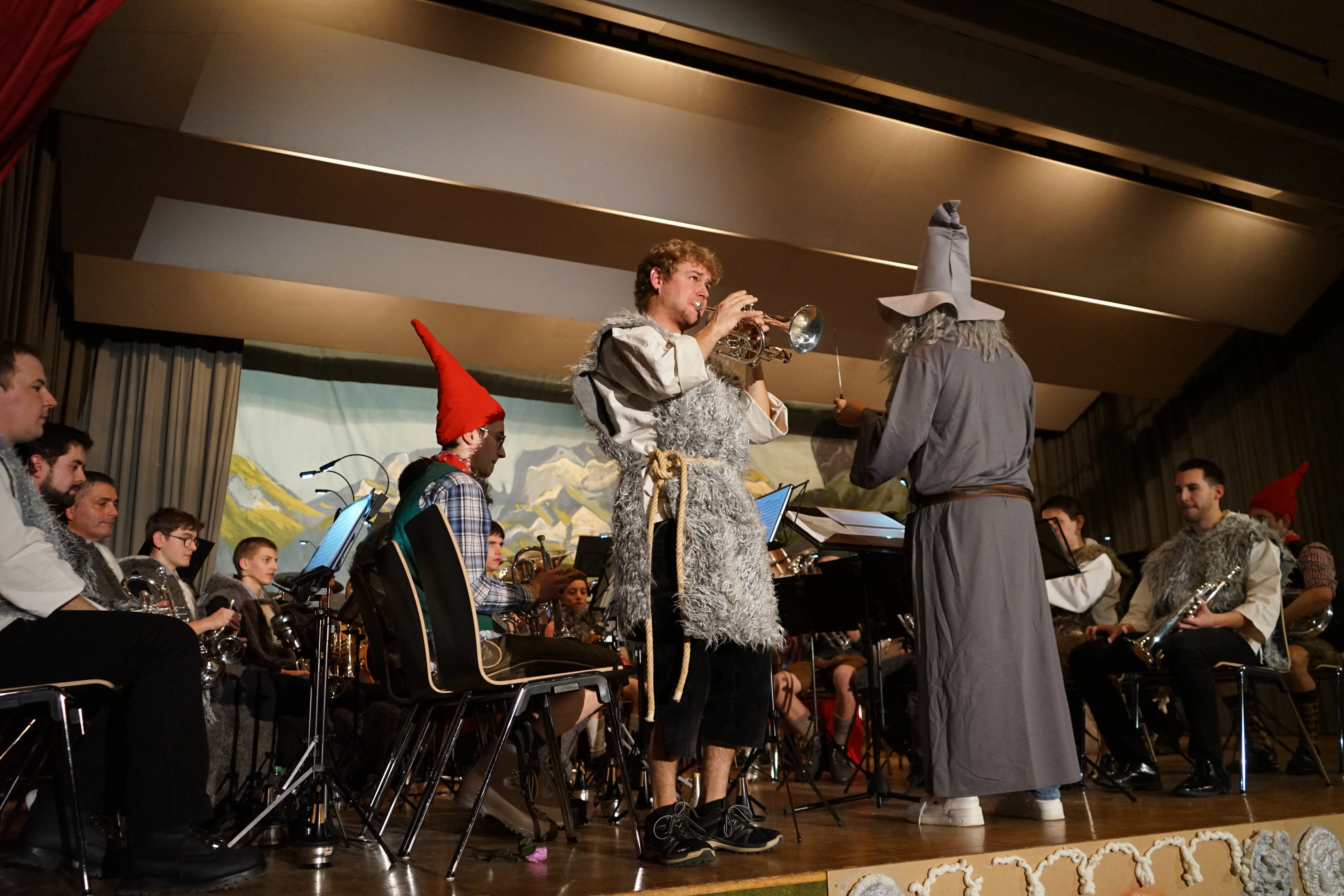 Die Reise führte in die Märchenwelt. Das sogenannte Ur-Märchen wurde gefunden, von dem die Gebrüder Grimm ihre Märchen abgeschrieben hatten. Alles drehte sich um Hänsel, der für einmal nicht den Nachhauseweg, sondern seine Gretel suchte, wobei ihn der gestiefelte Kater mit wertvollen Tipps, aber auch mit Marihuana und Kettensäge unterstützte. Die Bürgermusik spielte derweil die passenden Melodien, zum Beispiel das bekannte «Heiho» aus dem Film «Schneewittchen», als die sieben Zwerge in ulkiger Formation hereinspazierten. Ein eigenes Arrangement des Dirigenten Matthias Keller war das Stück «Story», bekannt als Titelmelodie der Fernsehserie «Grey’s Anatomy». Die facettenreiche Ballade mit sanften Tönen und starken Rhythmen bietet sowohl für das Ensemble als auch für Solisten herausfordernde Passagen.